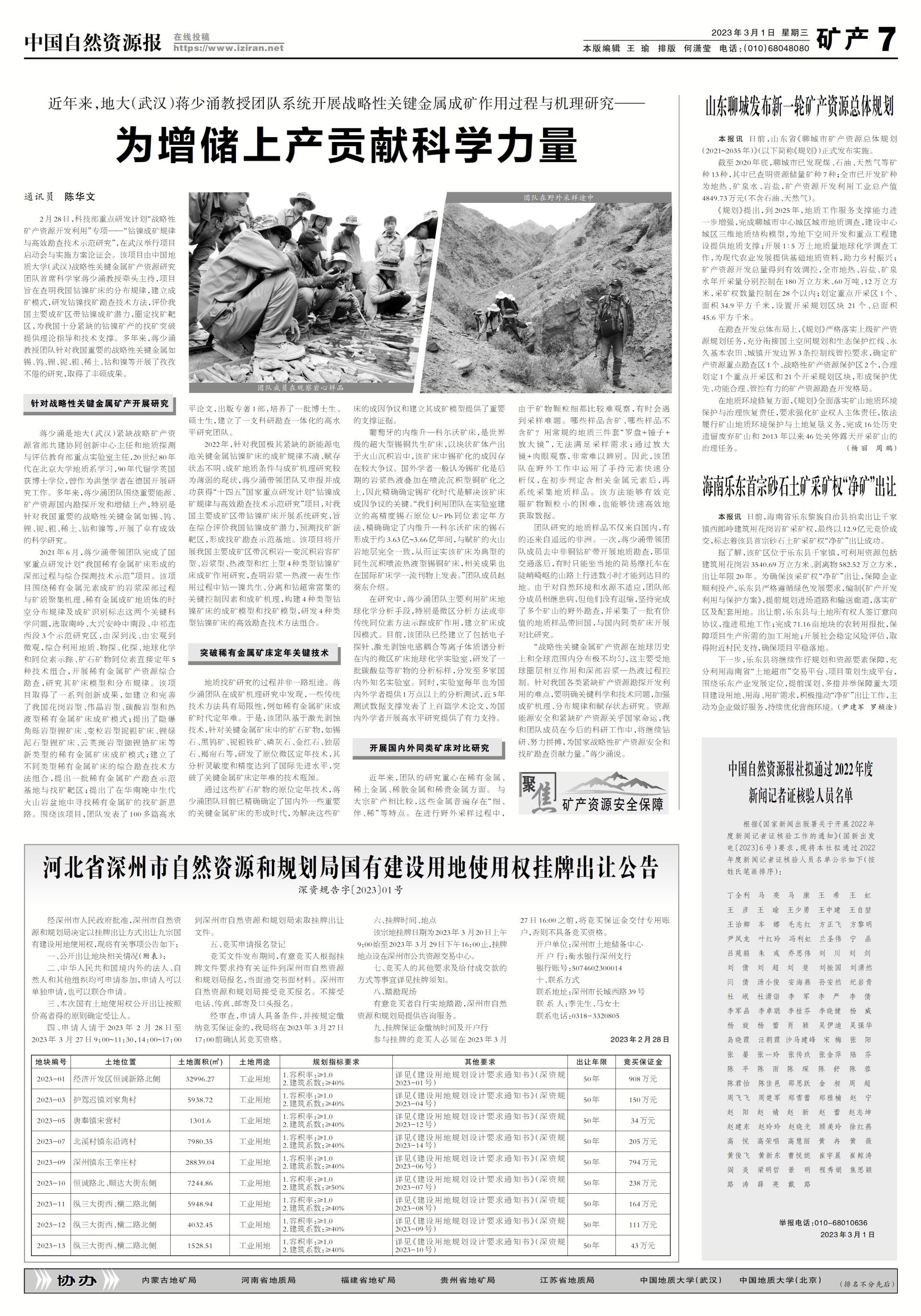 “战略性关键金属矿产资源在地球历史上和全球范围内分布极不均匀,这主要受地球圈层相互作用和深部岩浆—热液过程控制。针对我国各类紧缺矿产资源勘探开发利用的难点,要明确关键科学和技术问题,加强成矿机理、分布规律和赋存状态研究。资源能源安全和紧缺矿产资源关乎国家命运,我和团队成员在今后的科研工作中,将继续钻研、努力拼搏,为国家战略性矿产资源安全和找矿勘查贡献力量。”蒋少涌说。(陈文华)