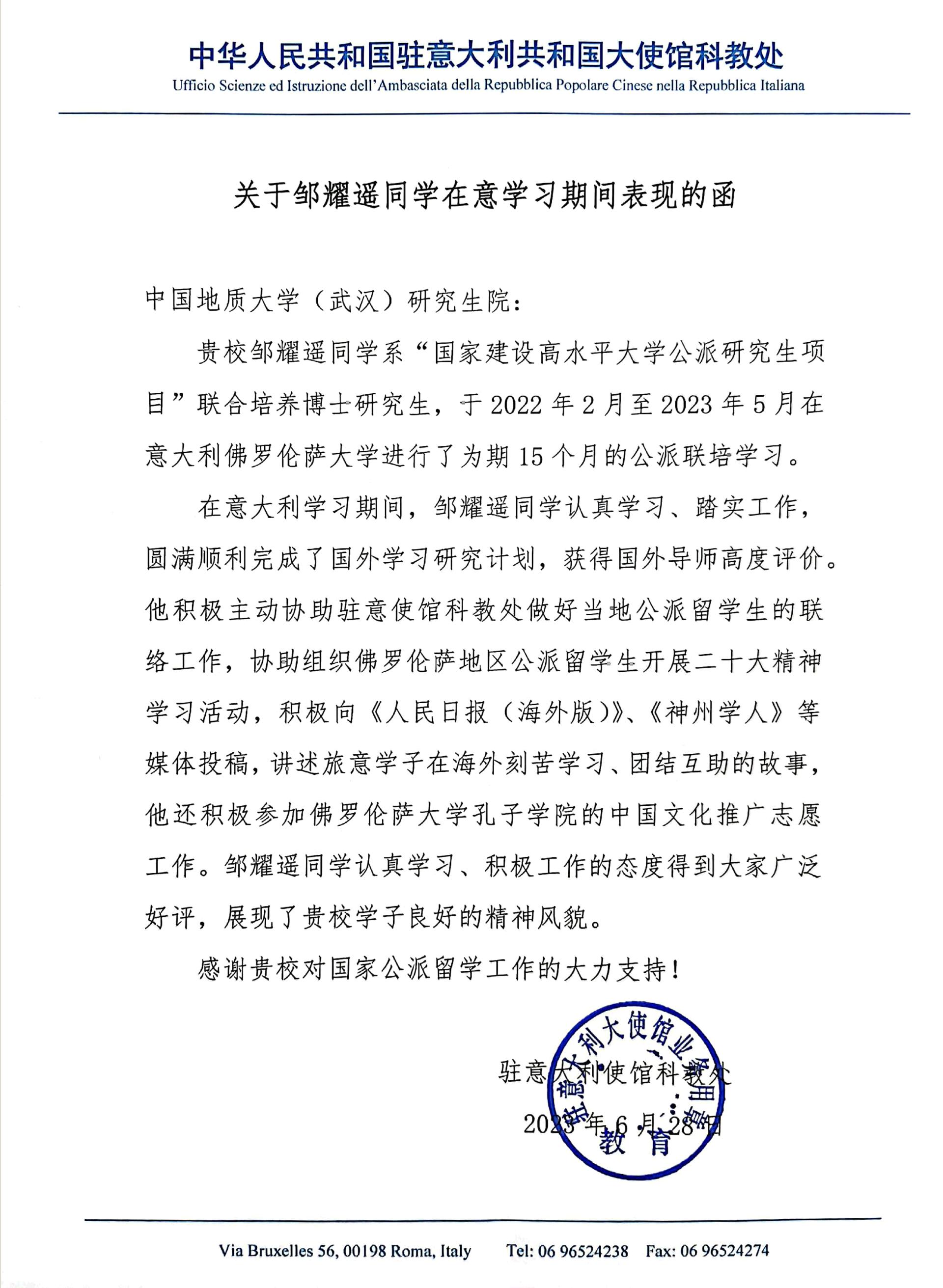 邹耀遥,我院矿产普查与勘探专业2019级博士研究生,我校第十三次党代会代表、校博士生讲师团成员。在沈传波教授的指导下,他主要开展含油气裂谷盆地的三维构造分析、构造热年代学及构造物理模拟实验研究,曾获研究生国家奖学金、校级优秀研究生标兵、校优秀学生党员等荣誉称号。2022年2月,获国家留学基金资助前往意大利佛罗伦萨大学进行博士联合培养,期间积极向《人民日报(海外版)》《神州学人》投稿,讲述旅意学子在科技合作与文化交流中的奋斗故事,获评全意学联“旅意学子优秀志愿者”,获我国驻意大利大使馆科教处致函表扬。